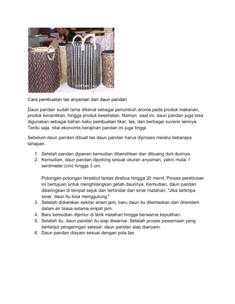 Kerajinan daun pandan ini merupakan suatu kerajinan yang dibuat dengan cara menganyam daun pandan yang telah kalian keringkan itu menjadi bagian kerajinan anyaman seperti alas sajadah, tikar, topi dan jenis kerajinan yang lainnya. Tikar pandan yang kini mulai langka karena tergusur produk serupa yang lebih modern ,, ternyata masih alas berbahan daun pandan yang dikeringkan itu merupakan hasil kerajinan warga setempat. Hasil akhir proses pembuatan tikar pandan. Selain digunakan untuk membuat kerajinan seperti yang telah dipaparkan di atas ternyata serat daun. Aug 27, 2020 · kerajinan dari daun pandan merupakan kerajinan yang dibuat dengan cara menganyam daun pandan yang sudah dikeringkan menjadi berbagai kerajinan anyaman seperti tikar, alas sajadah, topi dan aneka kerajinan lain.